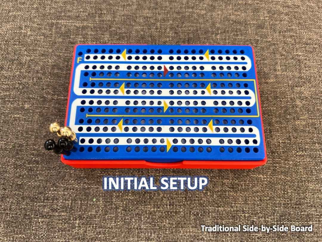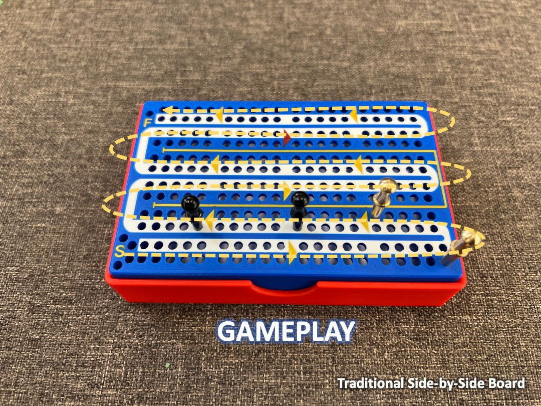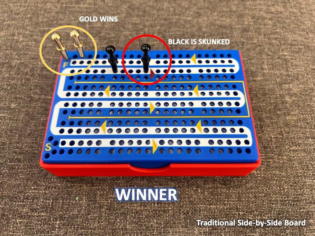 First player to the "F" hole wins. The skunk mark is indicated by a different color for the arrow at 90 points. Usually, this is red.