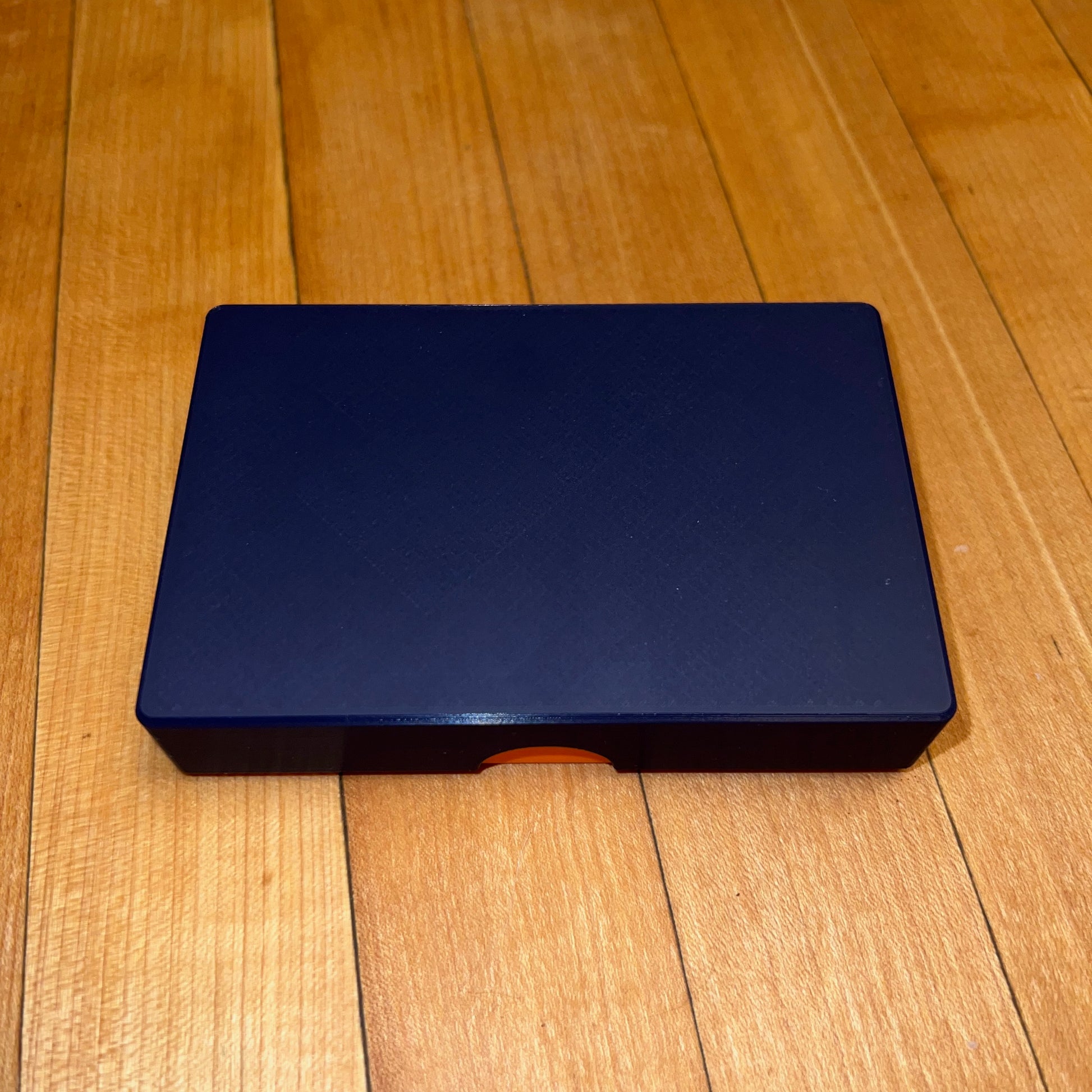 Travel cribbage board with solid color top. Fits in your pocket. Great for travel, restaurants, hiking, airports, etc. Includes a deck of cards and pegs.