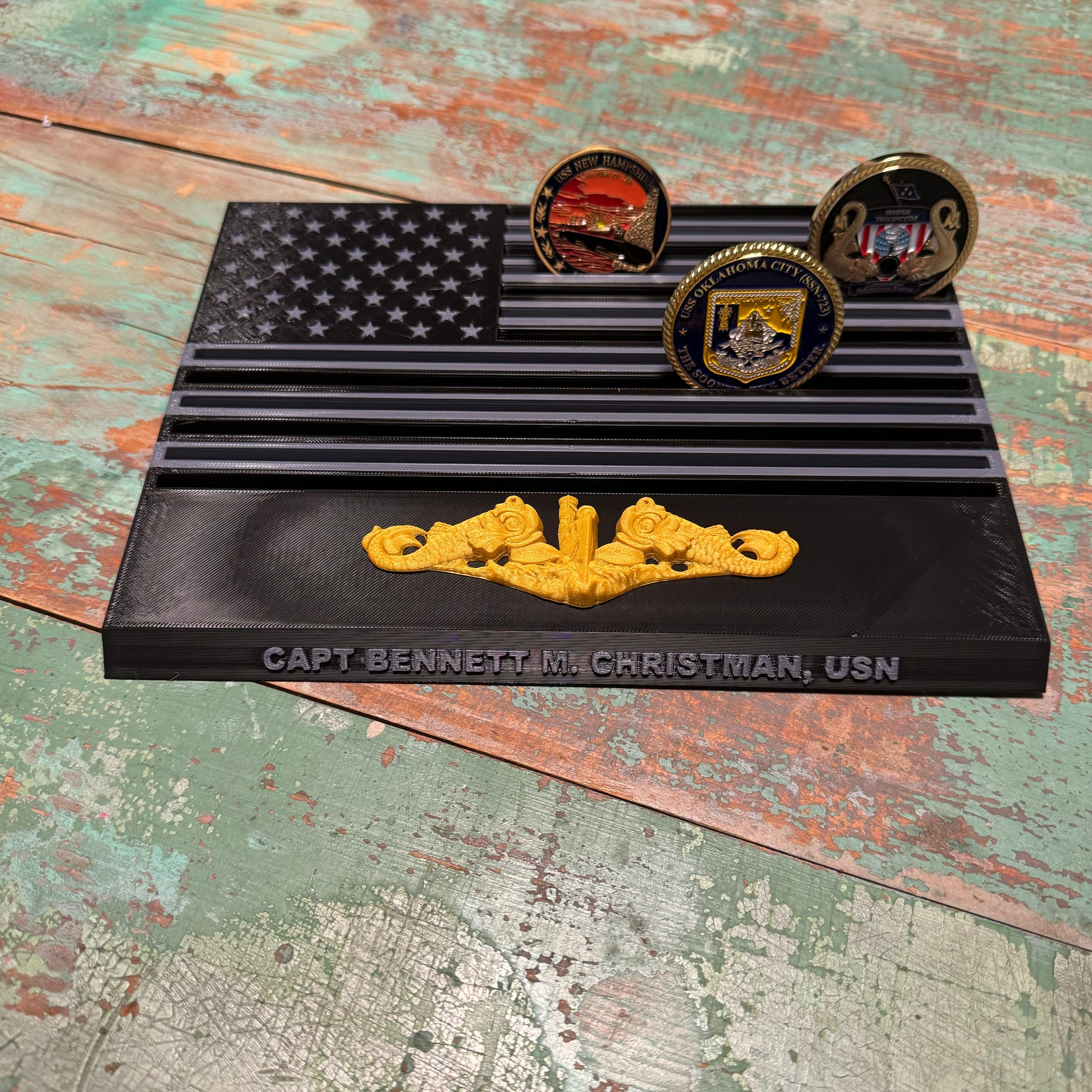 Display your favorite military challenge coins in the American flag and submarine themed holder. Measures 10”x9”x0.5”. Fits approximately 50 coins in the 13 rows. You can personalize the front with a name, motto, position, or just leave blank.