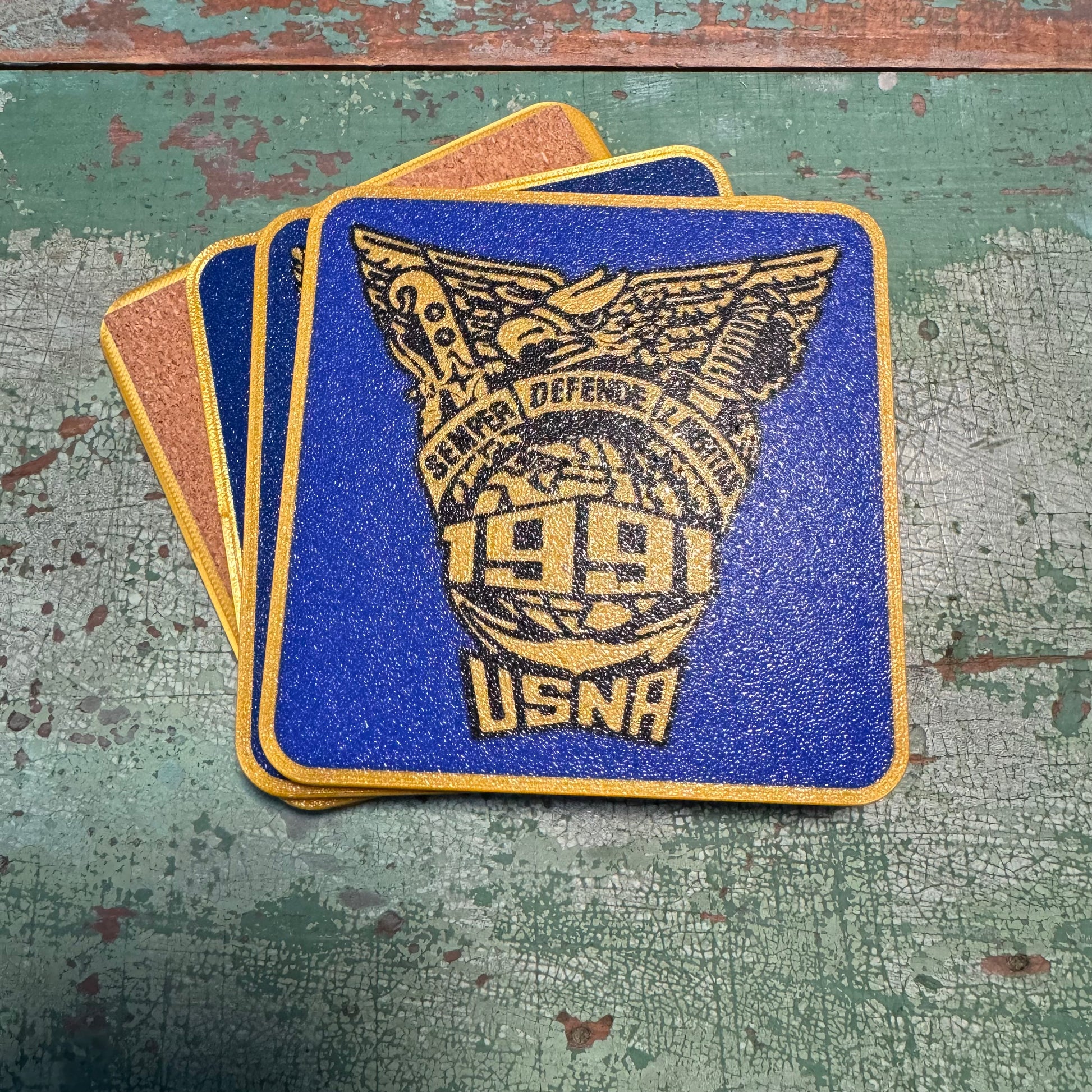 This is a set of four drink coasters with the USNA 1991 class crest. 3D Printed with a rough textured top finish and a cork back, it is perfect for your favorite beverage. Printed in high quality plastic, it is very durable. The graphics are inlayed plastic, not paint or ink. It will not wear off.
